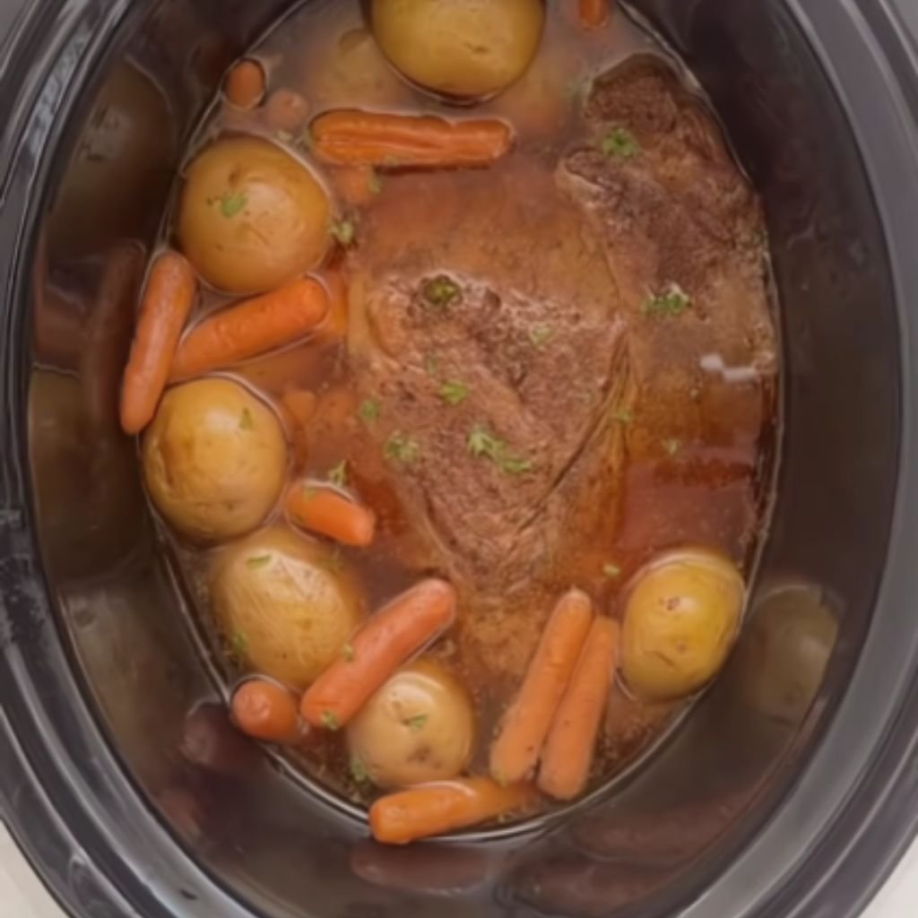 4. Cook on LOW for 6–7 hours. The roast will become tender and easy to shred while vegetables absorb flavor. Avoid opening the lid during cooking to maintain heat.