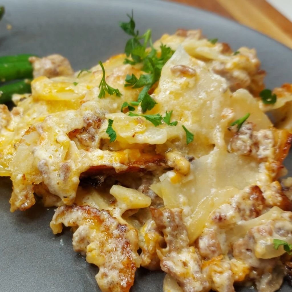 A hearty, comforting casserole combining smoked sausage with tender potatoes and onions. Slow cooking brings out the sausage’s smoky flavor while the potatoes soak up savory juices. Perfect for a filling lunch or dinner.