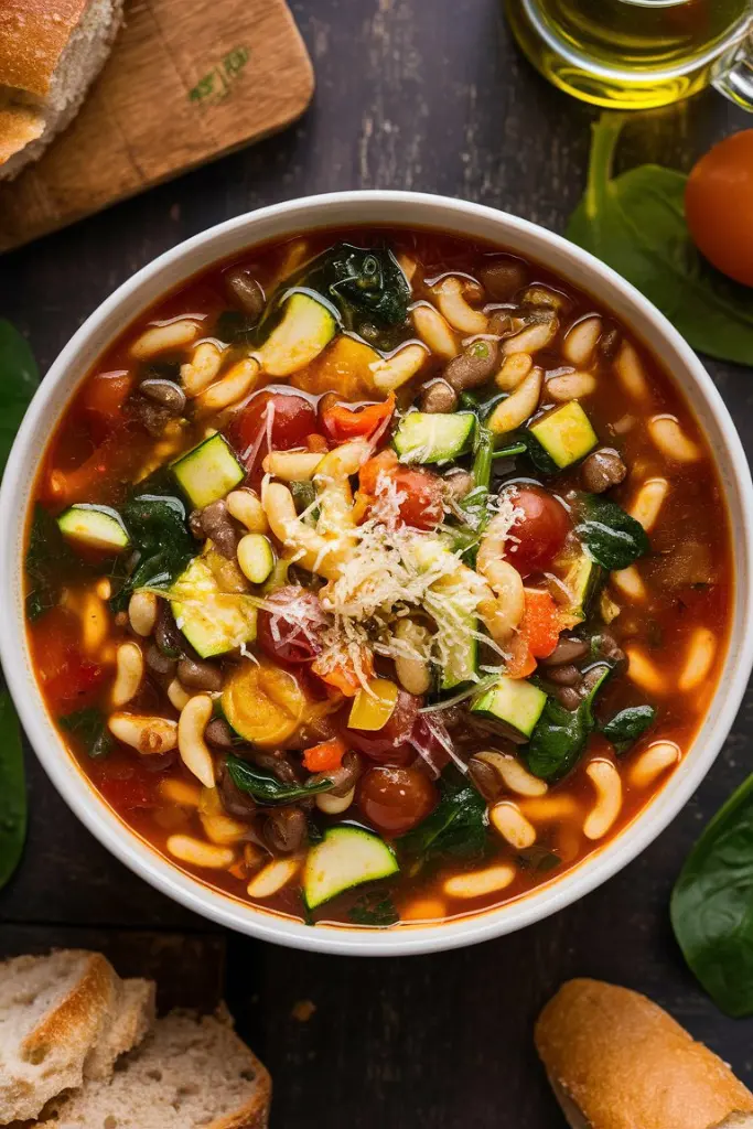 Minestrone Soup is a classic Italian dish that’s full of vegetables, beans, and pasta in a savory broth. It’s both filling and nutritious, making it a great choice for a light but satisfying lunch.