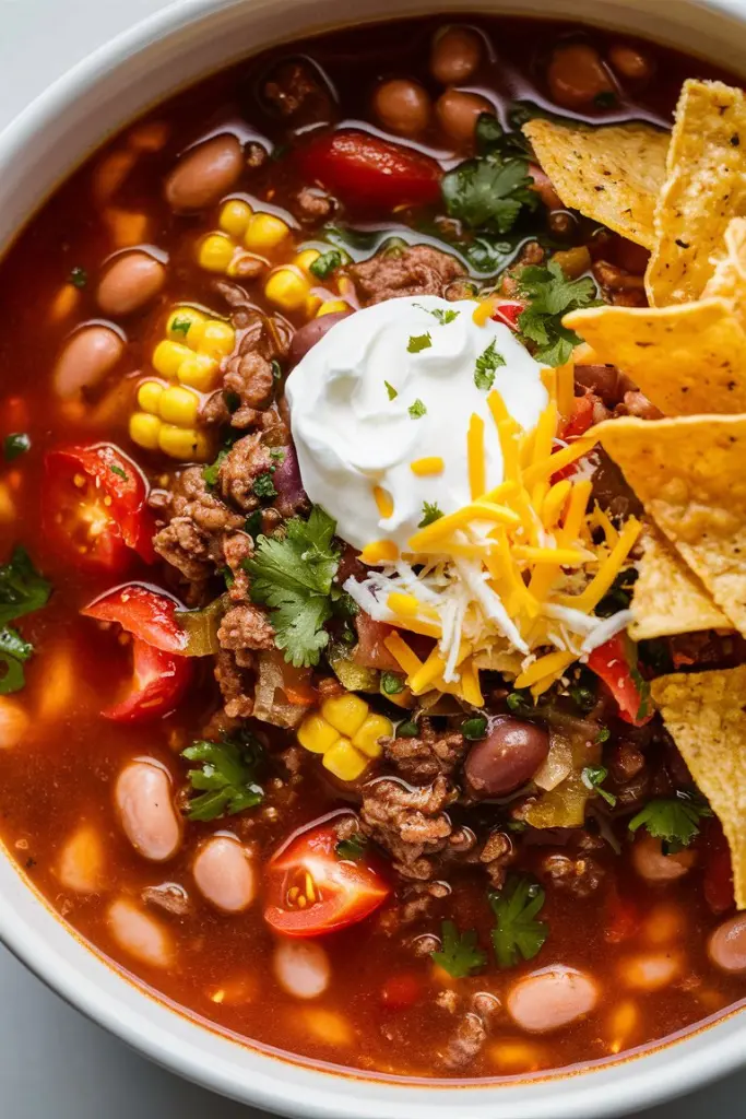 Taco Soup is a deliciously hearty meal that has all the flavors of a taco in soup form. It’s filled with beans, ground beef, and a mix of savory spices, making it a filling and flavorful lunch. Plus, it’s super easy to make!