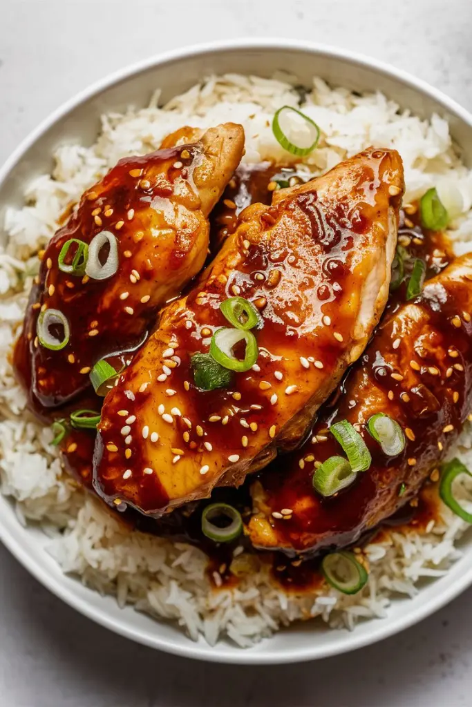 - Serve the chicken and sauce over cooked rice, garnished with sesame seeds.