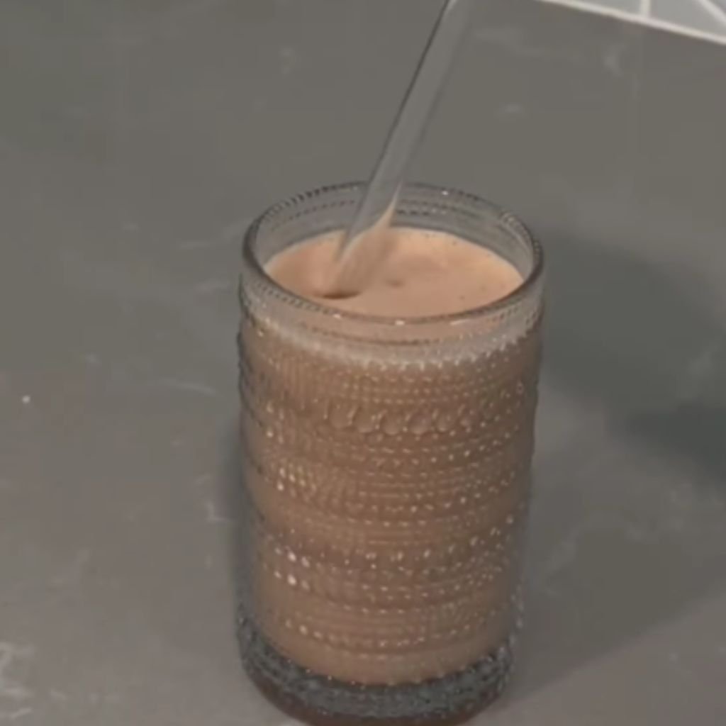 During blending, peanut butter mixes with milk and banana while cocoa dissolves into the mixture. The smoothie slowly becomes smooth and creamy.