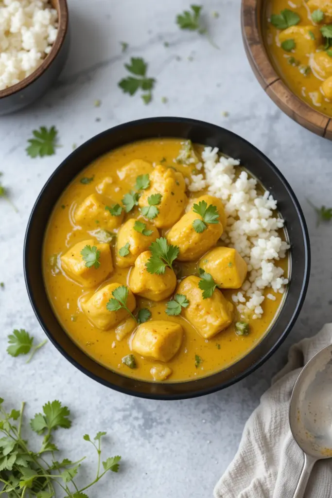 This slow-cooked chicken curry is aromatic and comforting, with tender chicken in a creamy coconut curry sauce. A great meal to enjoy with rice or naan.