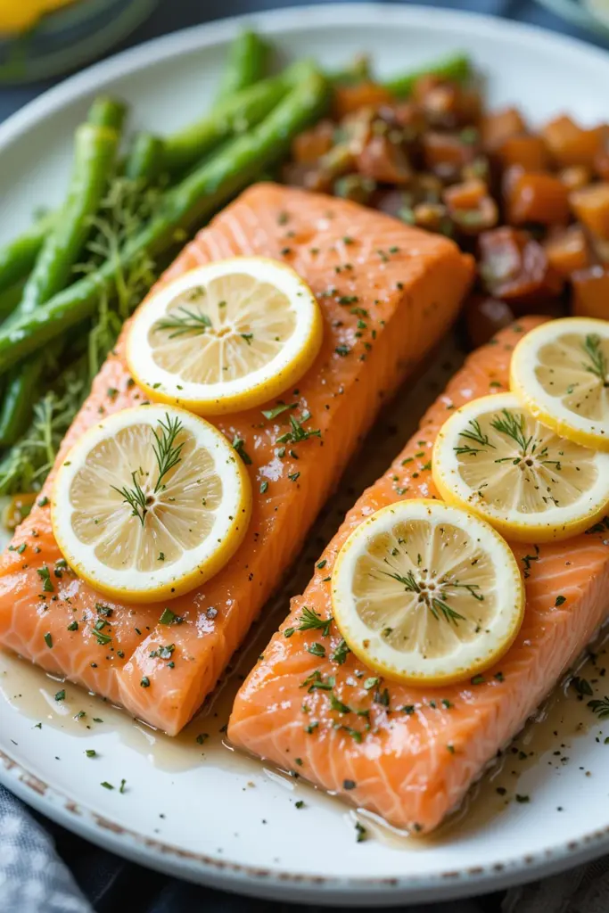 - Season the salmon: Season the salmon fillets with salt and pepper. Place a sprig of dill and a slice of lemon on each fillet.