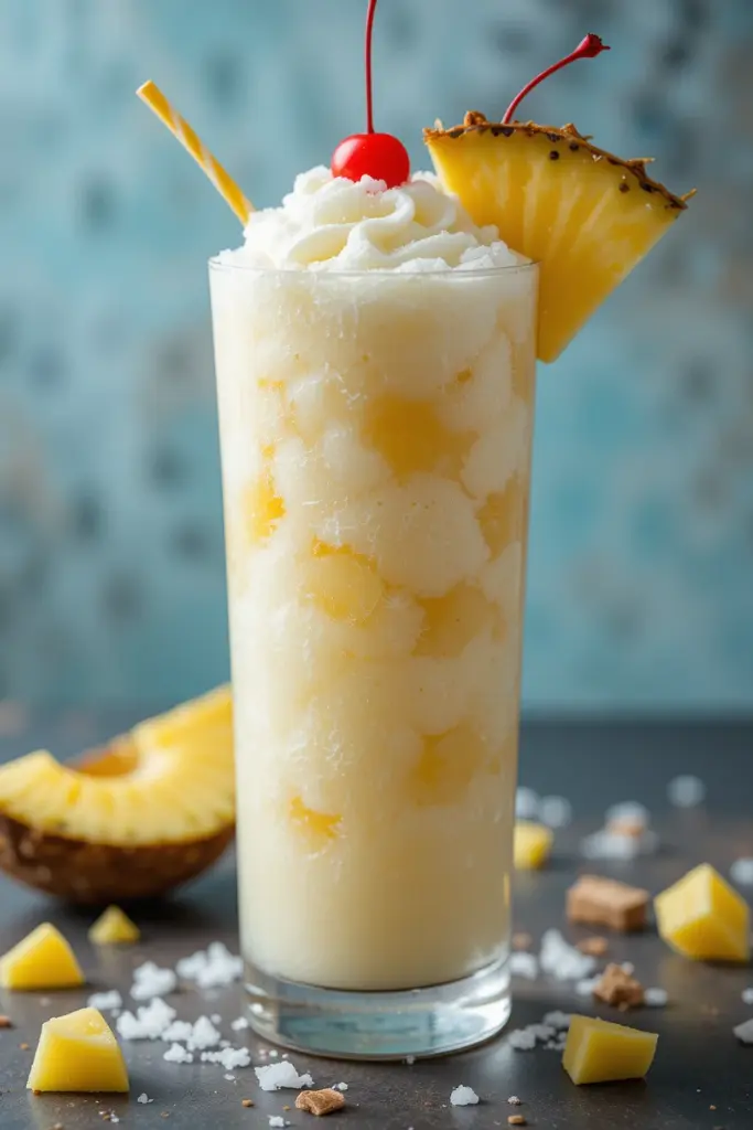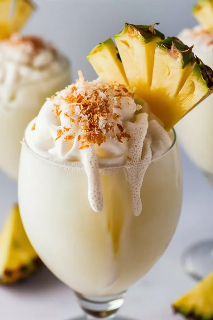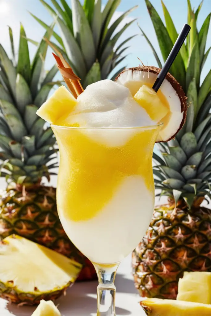 - Blend pineapple juice, coconut milk, rum, honey, and water until smooth.