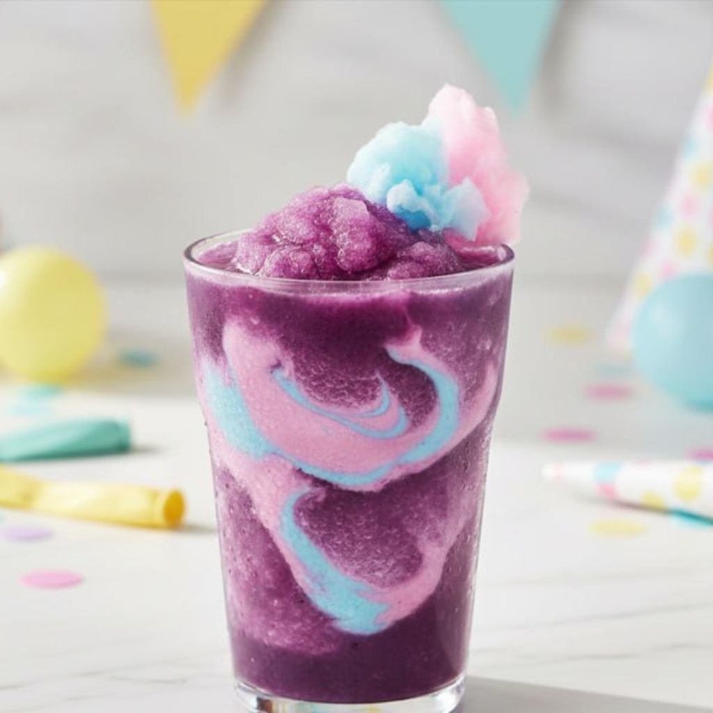 Colorful layers blend into a whimsical frozen drink with a sweet candy-like flavor. The mixture freezes into a smooth and airy texture that pours in soft, pastel streaks. Each sip carries light fruit notes with a gentle creamy finish that adds a dreamy feel to the drink.